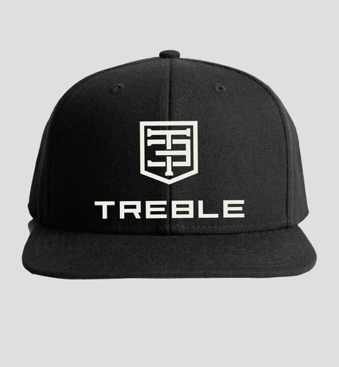 Treble "Stacked" logo hat. Structured 6 Panel, High Profile, Flat Peak Snap Back cap and embroidered logo, Heavy Weight 100% Cotton Canvas.