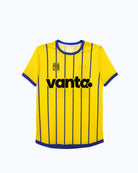 Crafted from 100% athletic polyester mesh, this jersey features a bold yellow base with clean royal-blue vertical pinstripes running across the entire front and back. The breathable athletic mesh gives it a lightweight, performance-ready feel while keeping the structure crisp. A large black VANTA. logo sits prominently across the chest, adding strong contrast against the bright yellow. The Treble crest appears on the left chest in black and yellow. Royal-blue collar trim, sleeve cuffs, and hem frame the jersey for a polished, professional finish. The look is classic, vibrant, and built for standout play.